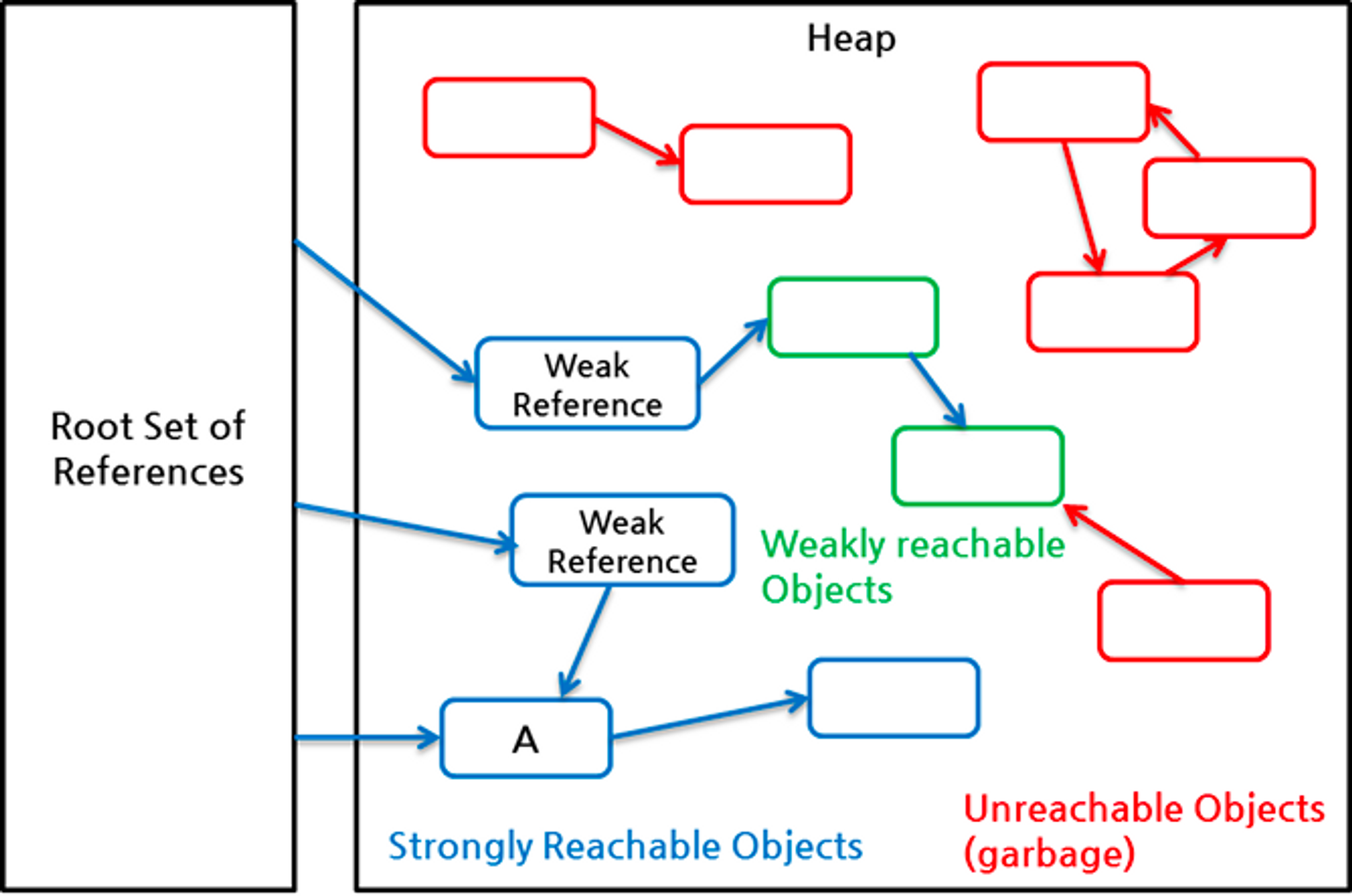 위에서 코드를 살펴볼 때 잠깐 언급한 위의 내용을 떠올려보자. 이게 어떤 의미를 갖고 있는지 설명해보려고한다. java는 개발자가 gc에 직접적으로 관여할 수 없다. 하지만 언어에서 제공하는 Reference mechanism을 이용하면 간접적으로 gc에 관여할 수 있게된다. Java GC는 객체가 gc 대상인지 판별하기 위해서 reachability라는 개념을 사용한다. 어떤 객체에 유효한 참조가 있으면 'reachable'로, 없으면 'unreachable'로 구별하고, unreachable 객체를 gc 대상으로 인식한다. 한 객체는 여러 다른 객체를 참조하고, 참조된 다른 객체들도 마찬가지로 또 다른 객체들을 참조할 수 있으므로 객체들은 참조 사슬을 이룬다. 이런 상황에서 유효한 참조 여부를 파악하려면 항상 유효한 최초의 참조가 있어야 하는데 이를 객체 참조의 root set이라고 한다.