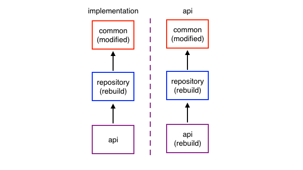 즉, implementation과 api의 차이는 transitive 정도의 차이이다. api로 dependency를 추가하게되면 repository를 의존하고 있는 다른 프로젝트에서도 common에 대한 api들이 노출되어 사용할 수 있게 되는 것이다. 따라서 api는 신중하게 사용하자.