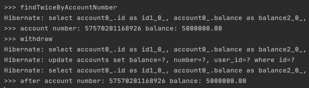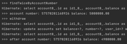 - findTwiceByAccountNumber 함수는 Account를 조회 후 5초 간의 sleep을 호출한 이후에 같은 accountNumber로 다시 Account를 조회한다.