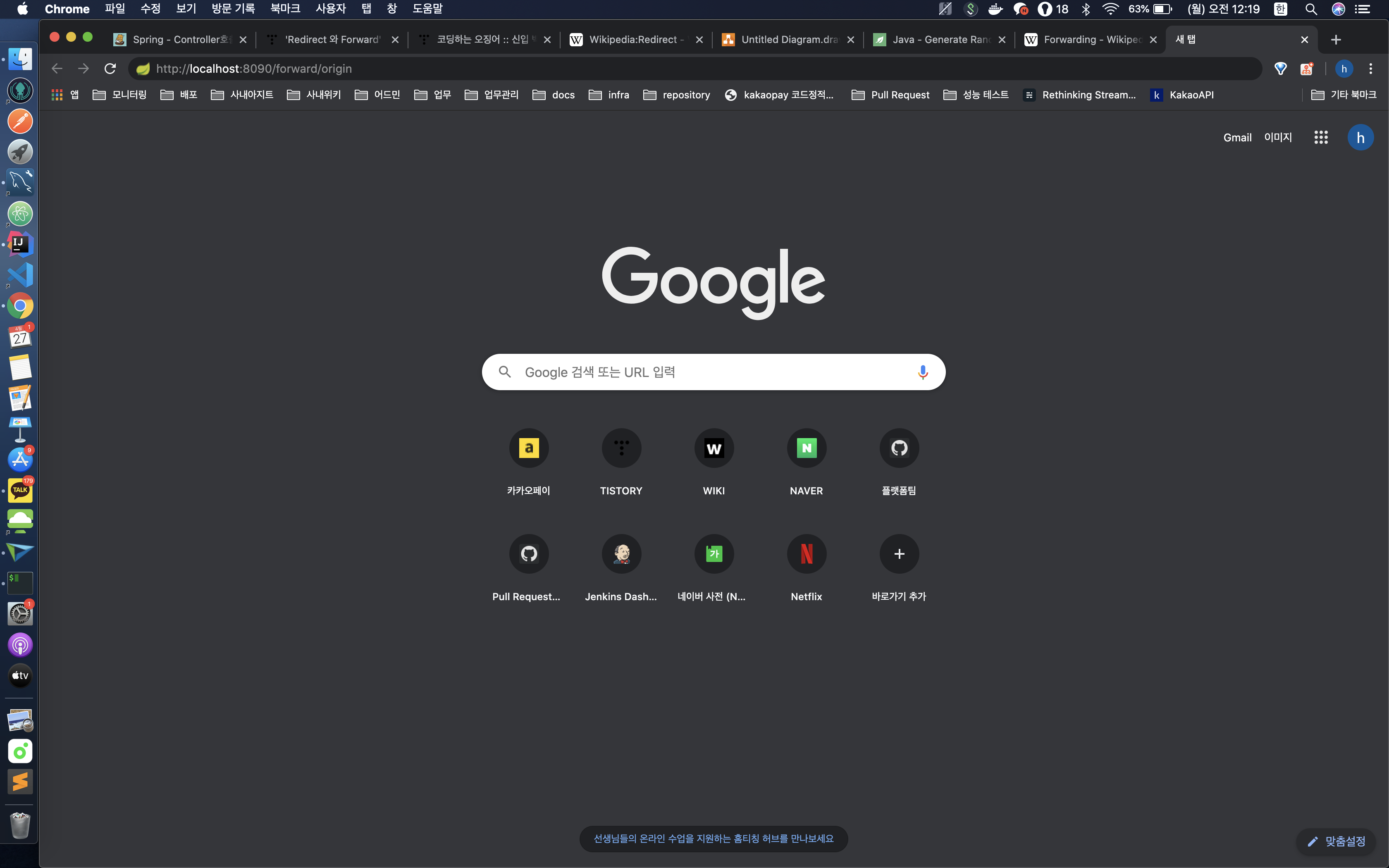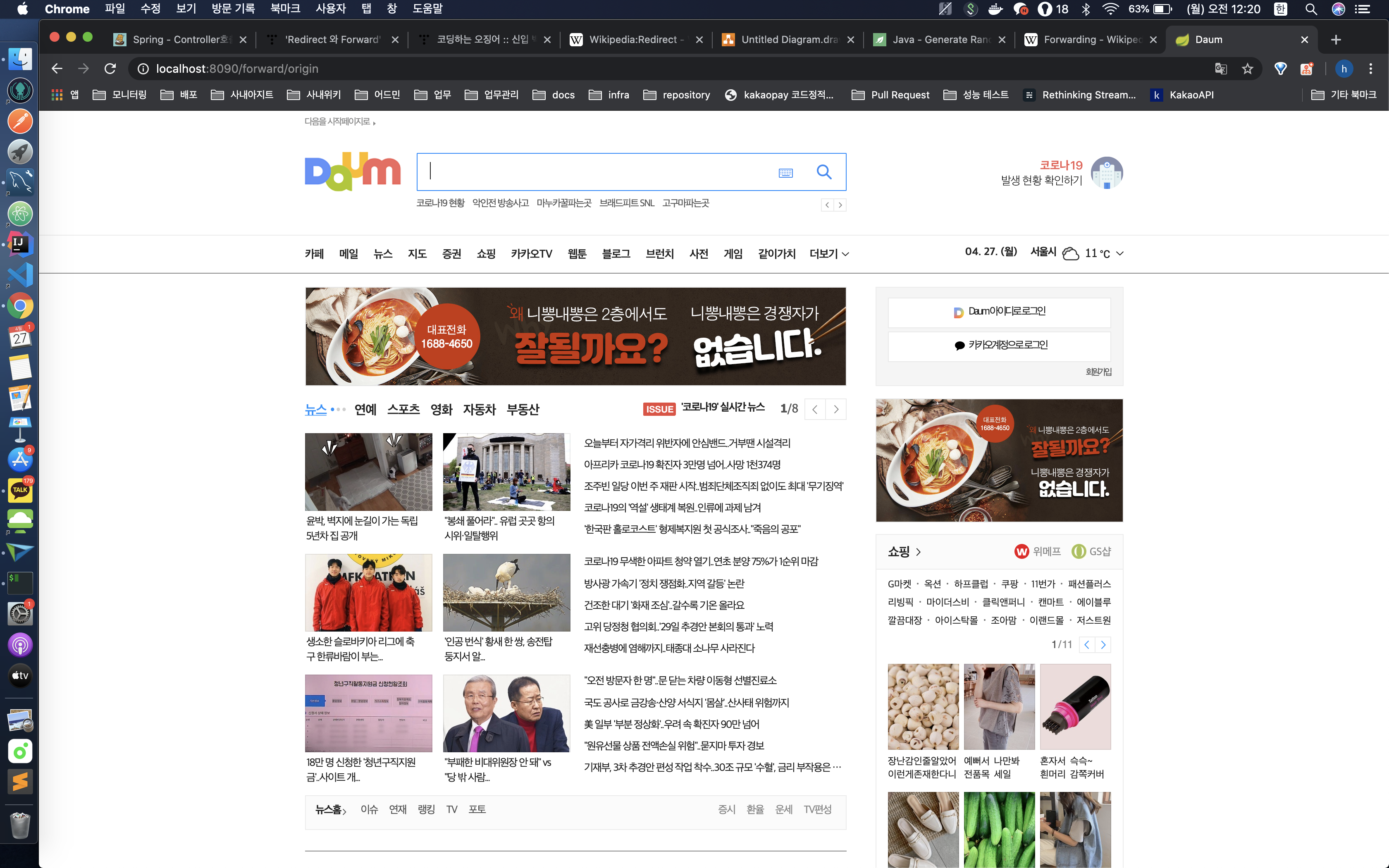 위의 코드를 보시면 /forward/origin으로 요청하면 www.daum.net으로 요청하여 받은 응답 값을 그대로 클라이언트에게 내려주고 있습니다. 결과는 다음과 같습니다.
