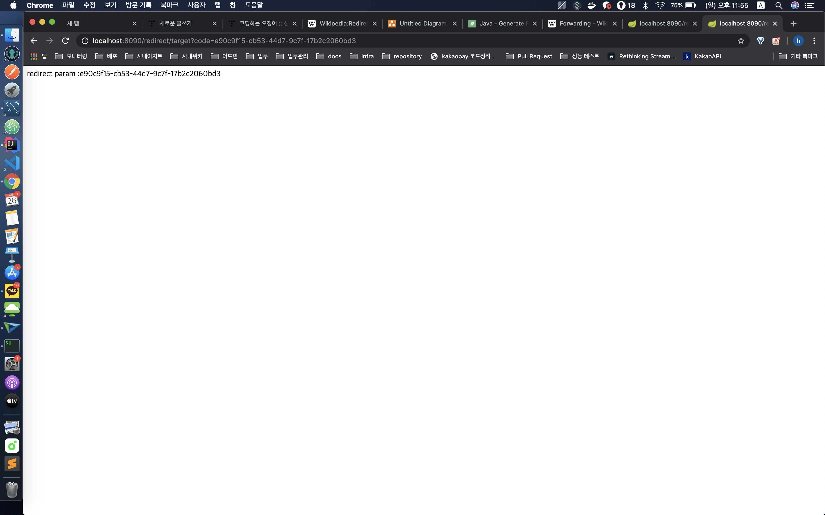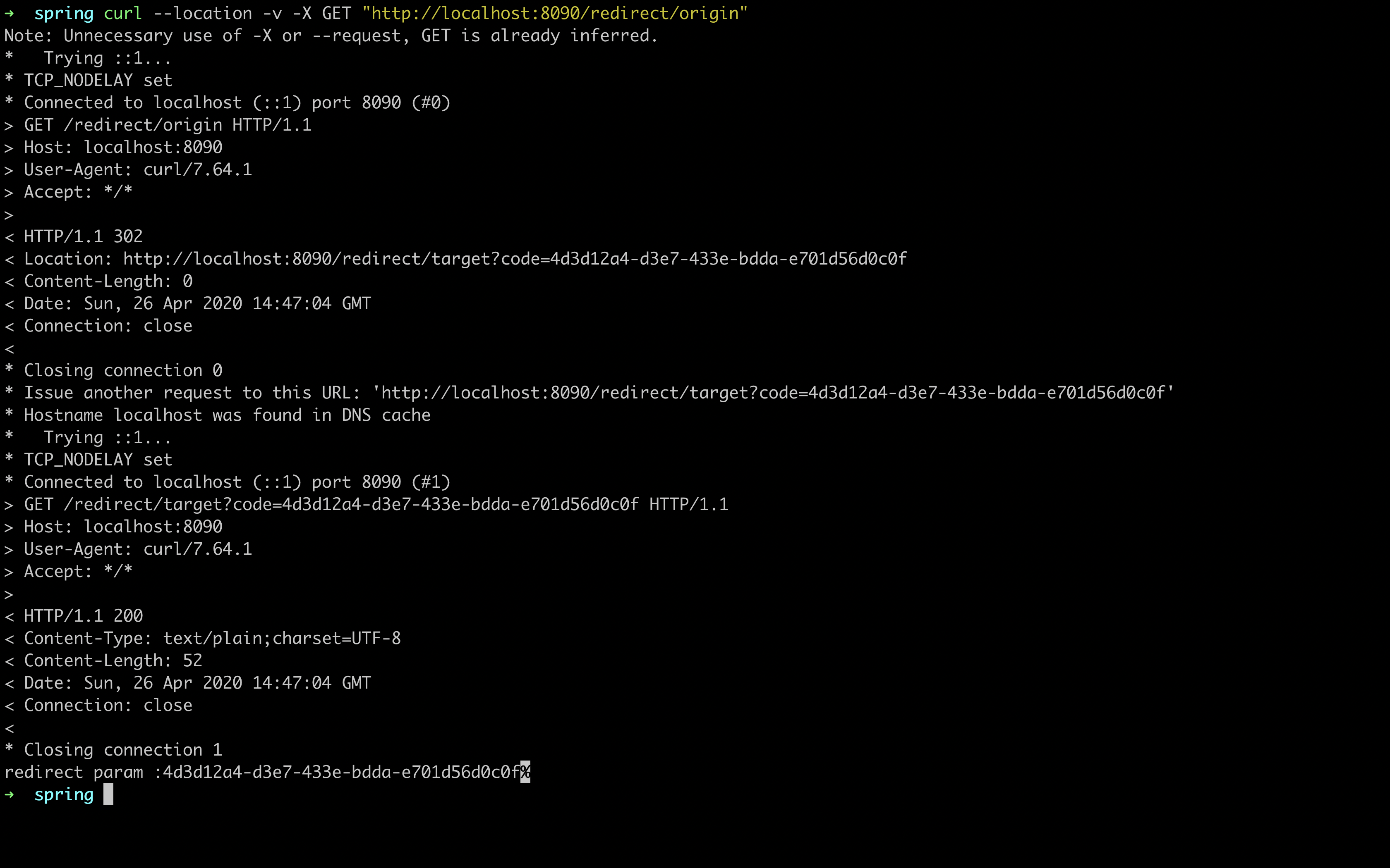 브라우저를 통해 실행한 결과를 잘 살펴보아야합니다. http://localhost:8090/redirect/origin으로 요청을 하였는데, 결과창에 url이 http://localhost:8090/redirect/target?code=e90c9f15-cb53-44d7-9c7f-17b2c2060bd3로 바뀐 것을 확인할 수 있습니다. forward와의 결정적인 차이임으로 기억해두길 바랍니다.